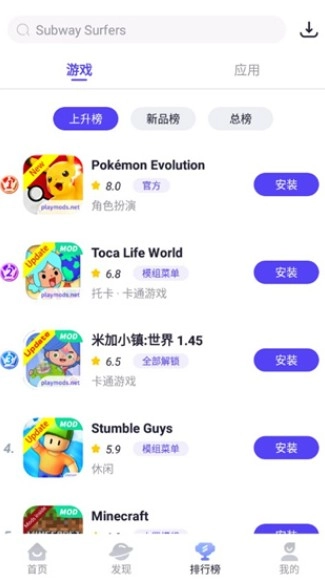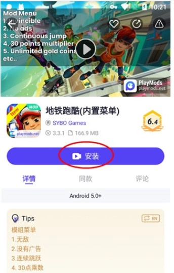 3、小编这里以地铁跑酷为例,在此界面中直接点击安装即可游戏。