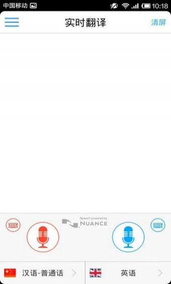 进入首页后,页面设计十分简约:下方有两个麦克风图标,上方是录屏区域,麦克风图标下方可选择源语言,右侧则是目标翻译语言——实际上这两个语言选择功能存在一定程度的重复。
