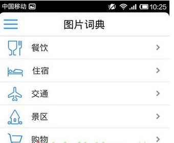 先瞧瞧图片词典,能看到餐饮、住宿、交通、景区、购物这些选项,它们都挺实用的,是旅游时常用到的功能。