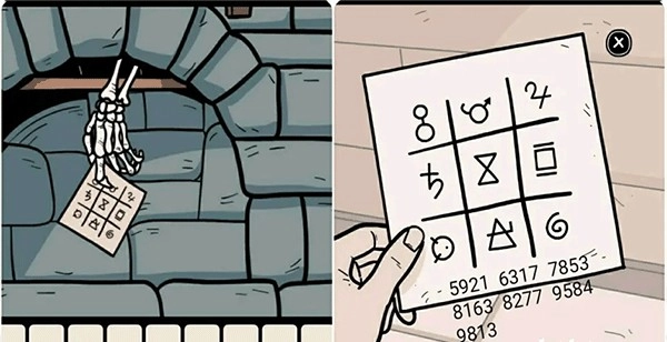 5、前往壁炉处,掀开画框上的白布触发剧情;随后用对讲机对着壁炉操作,会收到一张纸条。仔细观察纸条上的符号,再结合收音机的频道数字,就能得到对应的四个符号密码。