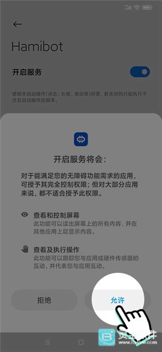4、按提示授予 Hamibot「无障碍权限」,不同系统可能有些许差异,请根据自己的系统启用权限;