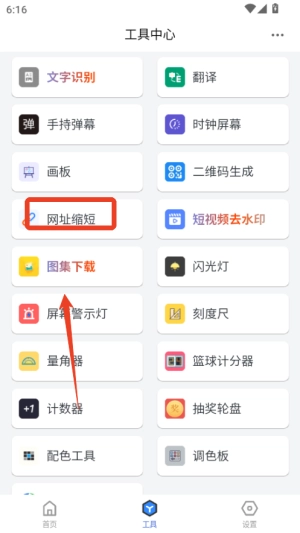 文字识别、翻译、手持弹幕、时钟屏幕、画板、二维码生成、网址缩短、短视频去水印、图集、闪光灯、屏幕警示灯、刻度尺、量角器、篮球计分器、计数器、抽奖轮盘、配色工具、调色板、取名字
