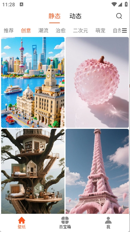 进入首页后,能看到多种类型的壁纸,像创意类、萌宠类、二次元类等都包含在内。