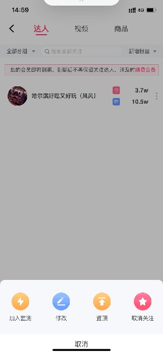 若要取消对主播监控数据的关注,操作方式如下:打开灰豚数据App首页,找到关注列表,点击“更多”选项,再点击竖向排列的“…”图标,即可完成取消关注操作。