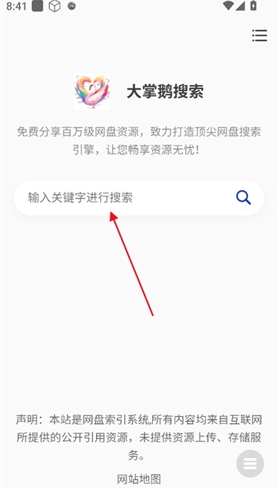 大掌鹅搜索安卓是一款**完全免费**的网盘资源搜索工具,能帮你查找影视、音乐、学习资料、办公文档等各类资源。它的免费版界面设计得很简洁清爽,去掉了复杂的布局和多余的信息,只留了一个简单的对话栏——你只要在这个对话栏里输入想找的内容,就能轻松完成搜索。而且不用注册登录,也没有广告、不用花钱,就能快速找到需要的资源,让搜索效率更高。