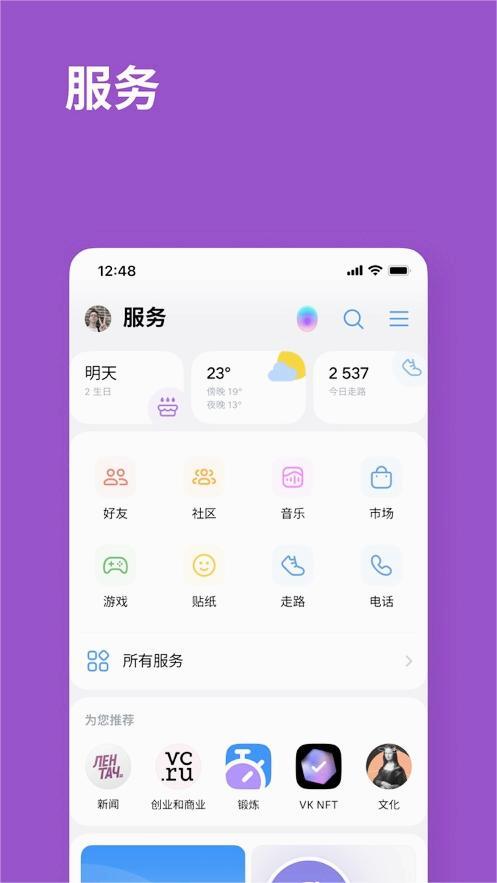 vk中文版是VKontakte的中文版本,这款来自俄罗斯的社交软件有点像国际版Facebook,不过它还增添了不少有趣的功能。VK中文版支持多人免费视频通话,让我们能和好友在线面对面交流;设有社区中心,方便大家分享生活里的各类动态;了音乐播放器,无需额外打开听歌软件就能享受音乐;最有意思的是,它还有短视频功能,各种好玩的视频让人刷得停不下来!