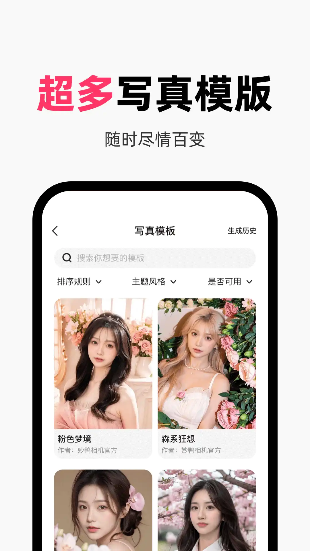 妙鸭相机免费版是一款能为用户提供丰富写真模板的手机AI拍照应用,用户可依据自身需求输入搜索条件,便能便捷获取心仪的排版,随后即可进行美美的拍摄。无论是实用的轻职场照、富有美学感的棚拍写真,还是时尚潮流的风格大片,各类风格一应俱全,可满足用户对拍照风格的全部需求。