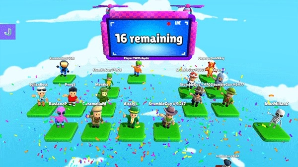 6、每个小关卡结束后,所有玩家都会出现在独立的小格子里,随后挑战失败的玩家会向下坠落并结束游戏,唯有淘汰掉所有其他玩家,才能赢得这场游戏的胜利。