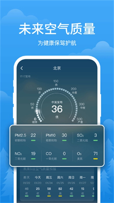 4、空气质量实时查询,PM2.5一目了然,从容面对雾霾污染。