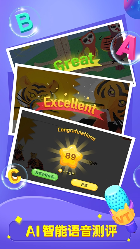 2. 语音智能评分功能,能够对孩子的录音进行智能打分,同时把发音不标准的地方标注为红色,助力孩子持续改善英语发音。