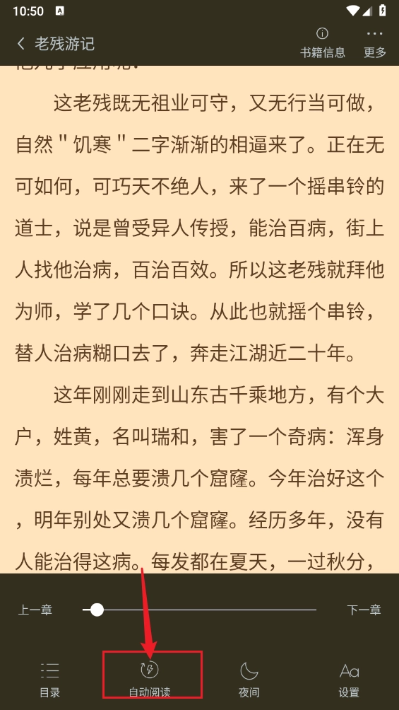 然后点击中间区域呼出菜单,点击"自动阅读"。