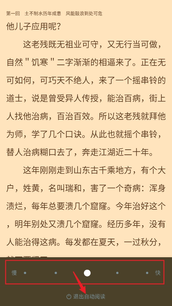 如图所示,自动阅读功能已成功开启,您可以根据需要调节阅读速度;若要退出自动阅读模式,点击底部的对应按钮即可完成操作。