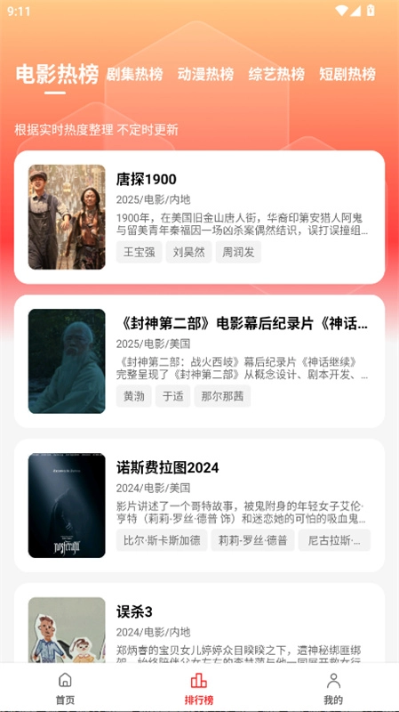 热度排行推荐:借助排行榜功能,按照热度对影视作品排序,向用户展示当前热门影视,助力用户迅速发现高人气作品。