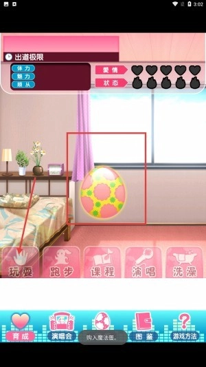 2、然后进行育成,对萌妹子进行玩耍,跑步,课程,演唱,洗澡等操作,会让她的魅力、体力、顺从大大提升,随着魅力的提升她的状态会越来越不好,直到状态耗尽,就不能对她进行相应的操作了。