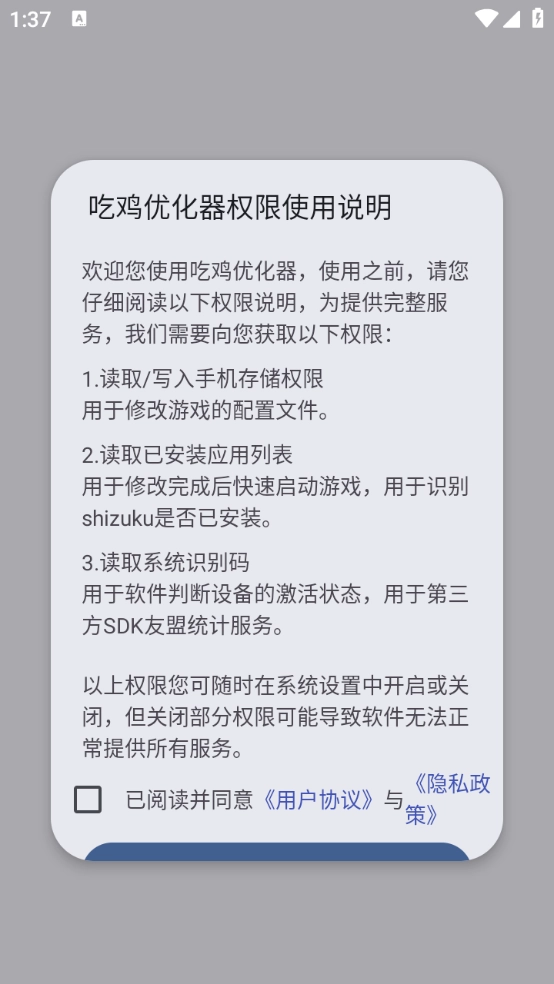 吃鸡优化器提供两种授权途径,您只需任选其一完成授权就能使用。为了更顺利地完成授权,建议您优先选用【文件管理器】方式,若该方式无法成功授权,再尝试【Shizuku】方式。