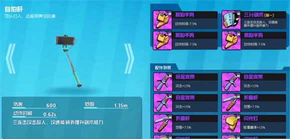 自拍杆主要分为三分流和斩铁流两个方向,常用的配件包括抓拍手势(对应速度属性)、合金支架(对应攻击属性)、折叠杆(对应范围属性)以及闪光灯(对应眩晕效果)。