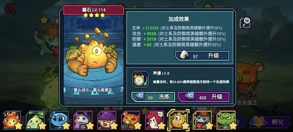 如图所示,右上方标注了对土系英雄及防御类英雄的额外提升效果,因此他的技能仅对土系英雄或防御性英雄生效——满足其中一个条件即可。举例来说:象神属于土系攻击型英雄,符合土系这一条件,技能会生效;灯神是光系防御型英雄,满足防御类要求,技能同样生效;而奥力作为土系防御型英雄,两项条件均满足,技能自然也会生效。