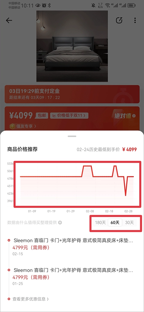 点击即可查看该商品30天、60天及180天内的历史价格变化曲线图。