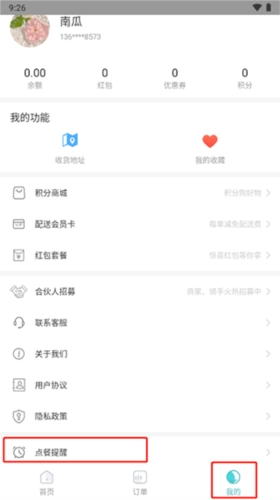 首先,我们打开,点击下方功能栏中的【我的】,然后点击【点餐提醒】;