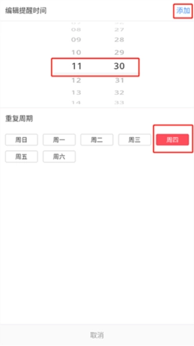 然后把时间设置妥当,例如周四上午十一点半,接着点击添加按钮就可以了。