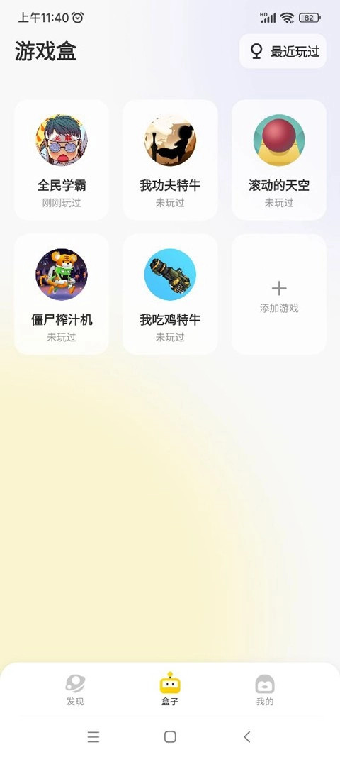 打开盒子,就能看到自己近期玩过的游戏,我最近玩了全民学霸、我功夫特牛、滚动的天空这些热门游戏。