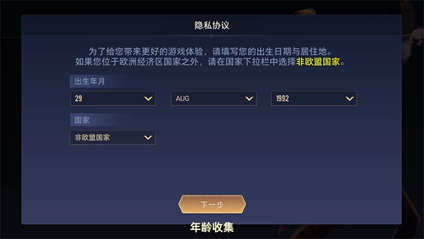 登录账号或者以游客身份进入游戏后,我们需要先填写国家信息和年龄信息。请注意:年龄不能太小。