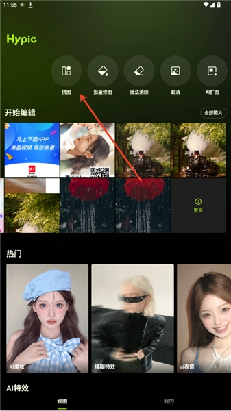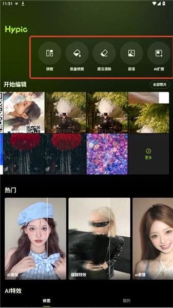 1.hypic打开hypic应用后,能看到首页的功能布局,点击中间区域的【拼图】【批量修图】【我的项目】【消除笔】任一选项,或是点击【+导入】按钮,均可进入修图页面。