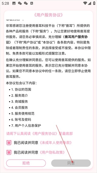 请先仔细阅读《用户服务协议》,然后勾选“我已阅读并同意《未成年人使用条款》”和“我已阅读并同意《用户隐私政策》”这两个选项,最后点击【同意】按钮来确认接受相关协议。