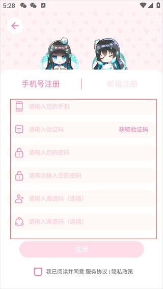 在手机号注册表单中,需依次填写手机号、获取并输入验证码、设置并确认密码,邀请码与渠道码为选填项。