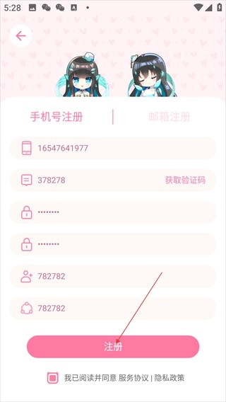 勾选“我已阅读并同意服务协议|隐私政策”,点击【注册】按钮,完成账号注册。