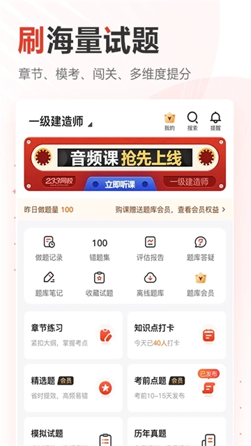 每日一练、章节练习、模拟考场、历年真题海量试题,配备名师视频解析掌上刷,另有做题记录、错题集、收藏试题、积分试题离线刷,以及个性化做题习惯设置,移动学习更方便!