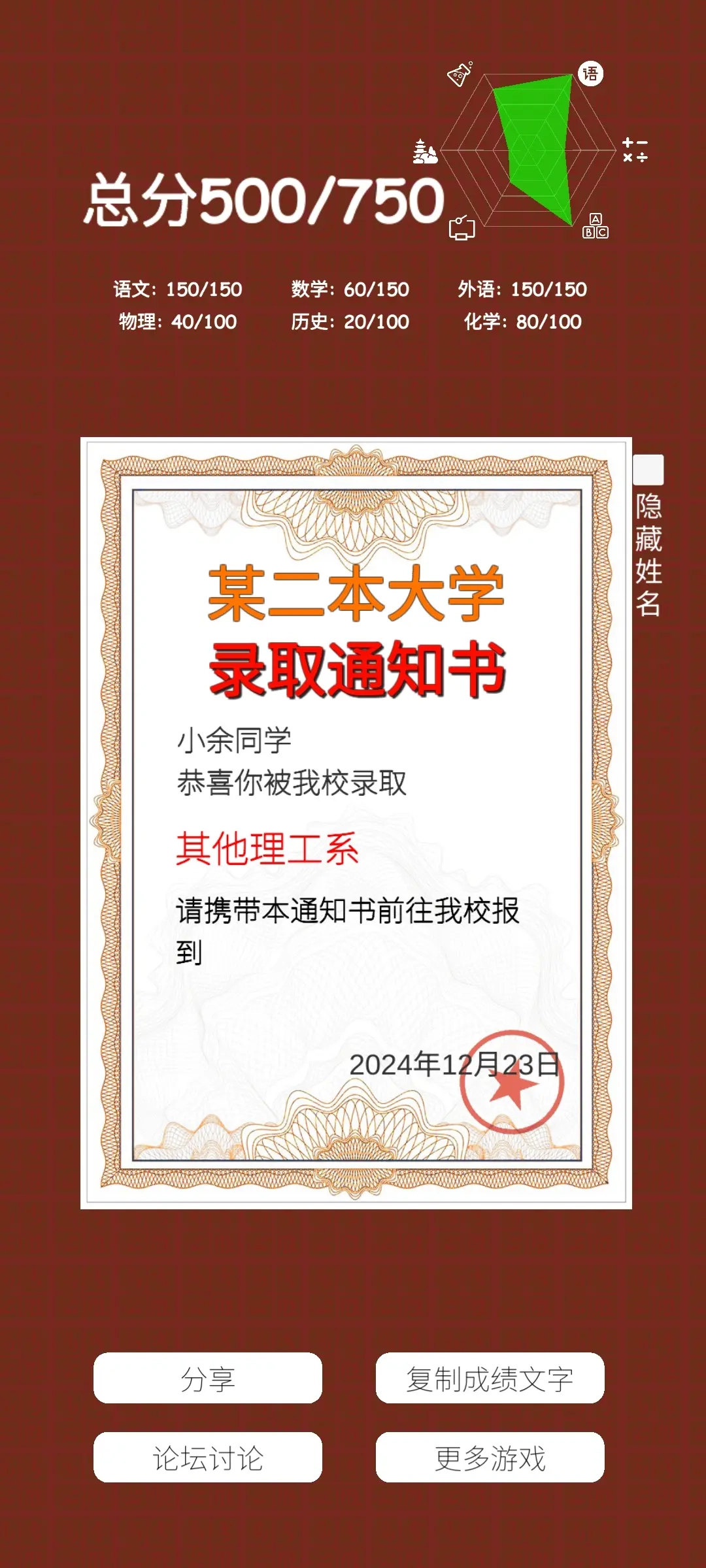 你的录取结果将由考试成绩决定,不同的成绩会让你收到来自不同知名院校的录取通知书。