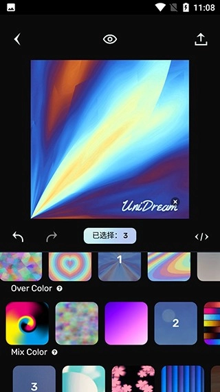 可以叠加多种艺术效果,选好后点击图片上方的小眼睛图标就能预览效果,之后点击右上角的保存按钮或分享按钮来处理作品。