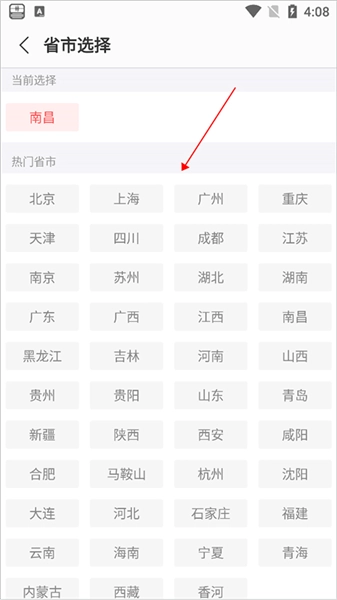 第三步:进入页面后,能看到北京、上海、广州、重庆、天津、四川、成都、江苏等众多热门省市,我们只需向下滑动页面,找到自己所在的省市就可以了。