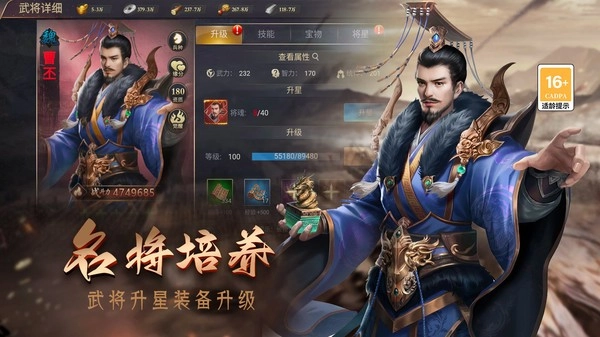 您可以在游戏中对武将进行升级、进阶,以此增强武将的战斗力并增加其带兵数量。