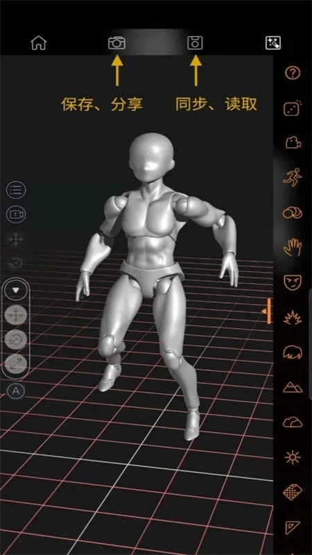 调整好人偶动作后,点击页面顶部的图标,按顺序点击这些图标,就能把内容保存到本地、分享出去,还能同步到云端。之后就可以开始临摹创作了。