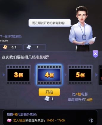 点击开拍按钮后会进入档位选择界面,当前设有1至7档不同选项。档位越高,对应的收益也会相应增加,但与此同时,拍摄难度也会随之提升,这种难度提升主要体现在对艺人各项属性的要求更为严格。