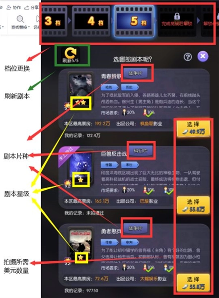 要是这里面没有你想拍的合适剧本,可以点击左上角的「刷新」按钮来更新剧本。剧本设有星级,星级范围是1到4,星级越高,能上阵的角色数量就越多,电影的上限值也会随之提高。