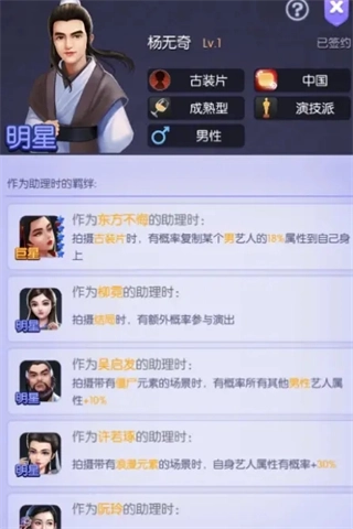 明星级艺人堪称艺人圈里的中坚力量,既能担纲主演拍电影,也能俯身协助做助理,他们自身配备3项技能,且在角色驾驭和剧本适配方面各有专长,再加上明星合同获取难度较低,因此建议着重培养契合您擅长影片类型的明星艺人。