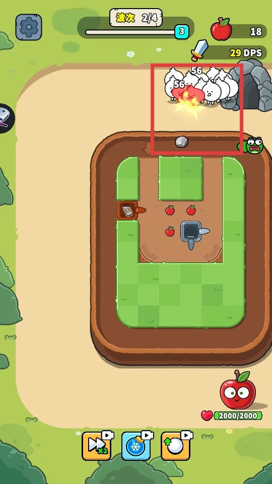 在地图上布置防御设施,消耗苹果资源购买并放置后,点击【开始战斗】,抵御敌人的进攻。