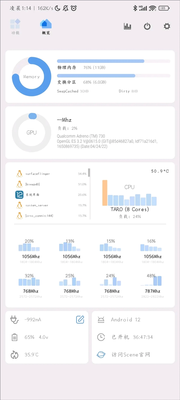 进入首页后,我们能够直观地查看各类手机数据,包括手机的内存使用情况、系统进程、CPU占用率以及各个核心的运行状态等信息。