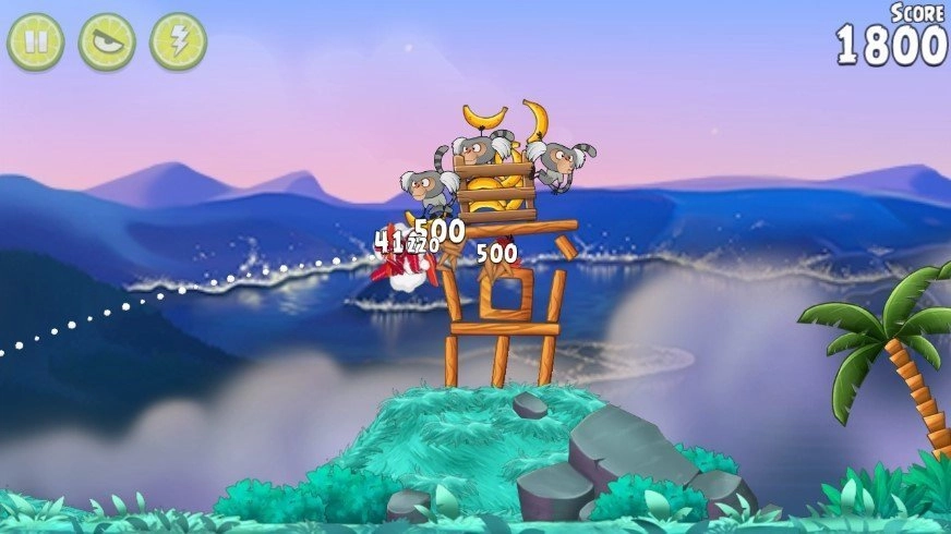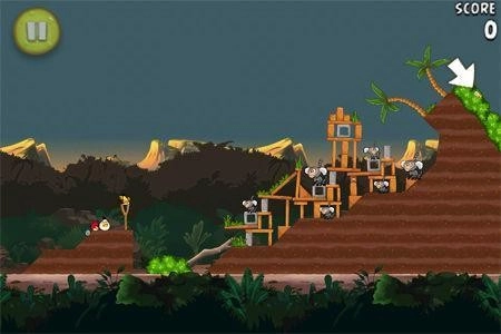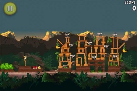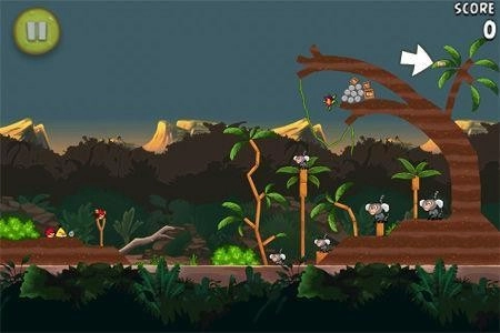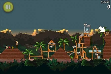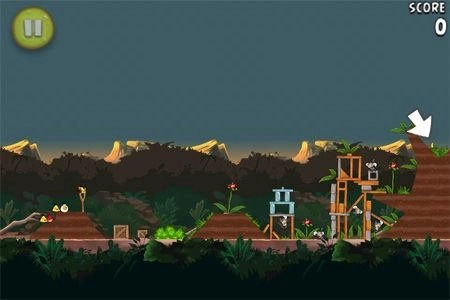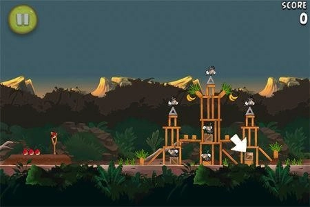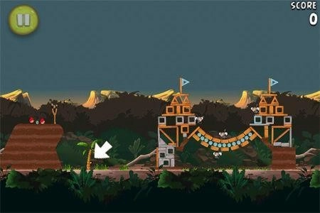 箱子藏在一处高高的平台上,发射黄色小鸟就能拿到里面的香蕉。
