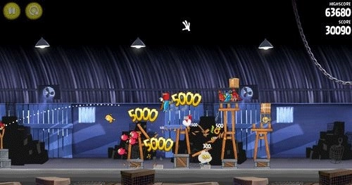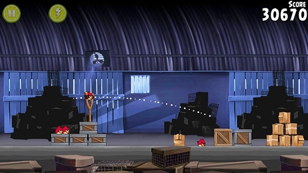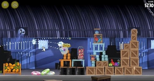 这一关有点棘手,对操作的精准度要求比较高。你得操控黄色小鸟瞄准建筑物中间那个方块形状的空心木架,并且射击时要保证先把第一个笼子摧毁掉。只要用一只小鸟完成任务就能拿到三星啦。
