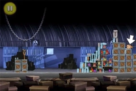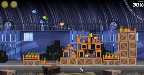 凤梨藏在箱子堆下方右侧的箱子里,上面也贴着一个标签。朝高空发射一只蓝色小鸟,要是它能精准着陆,就能把这个箱子炸开。由于难度不小,你或许需要多次尝试发射,才有可能成功炸开箱子。