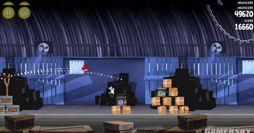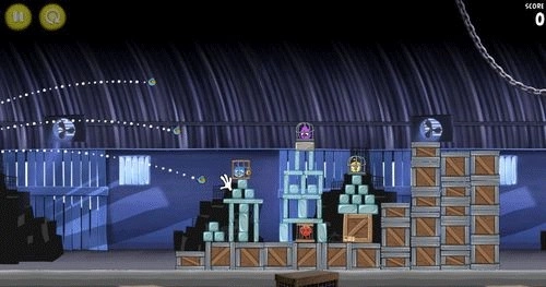 如下图所示,射击时需瞄准障碍物的下部。同时要确保你的红色小鸟最终击中最右侧的笼子,使整个障碍物失去平衡并向左倾倒。仅用一只小鸟完成任务即可获得三星。