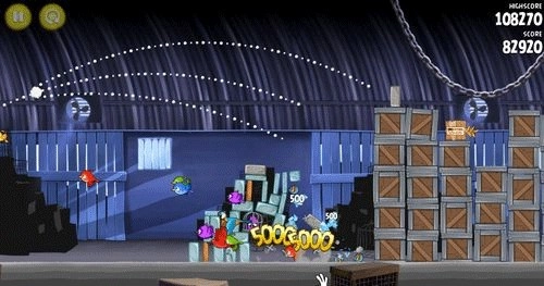 这一关会解锁新的黄色小鸟。它的飞行速度极快,但对石壁和玻璃墙的破坏力比较一般。不过对付木头搭建的壁垒时,它就像利刃破纸般轻松,能让你闪电般突破防线,把敌人埋在堡垒的残骸里。发射后还能再点一次鼠标左键触发加速攻击,这关很容易,操作如图所示:瞄准左边建筑的中间位置发起攻击,让它连带周围结构一起倒塌;右边的石头会自动帮你清理剩下的目标。