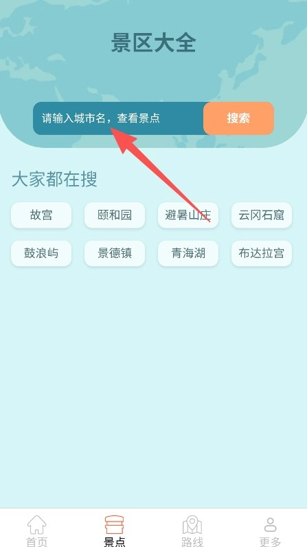 打开软件进入景点页面后,可在搜索框输入城市名称,也能直接选择热门景点。