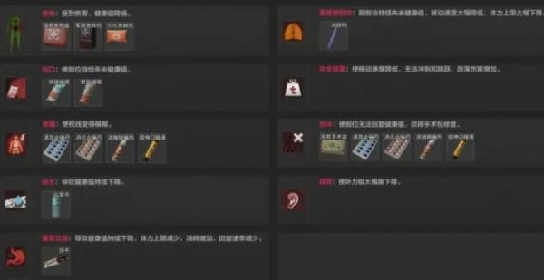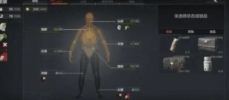 当口袋与弹挂里装有医疗物资时,我们能快捷使用,不过这种方式没办法指定优先治疗的部位。要是碰到医疗物资紧张,同时身体多个部位受损的状况,就可以打开背包,切换到健康页面,针对不同部位开展治疗,例如先处理腿部的损伤,让移动能力得到恢复。