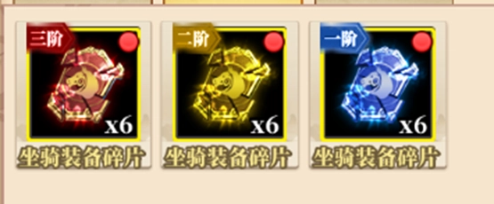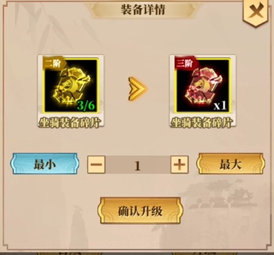 坐骑装备碎片支持升级操作,每3个一阶装备碎片能够合成1个二阶装备碎片,后续更高阶的升级规则以此类推。