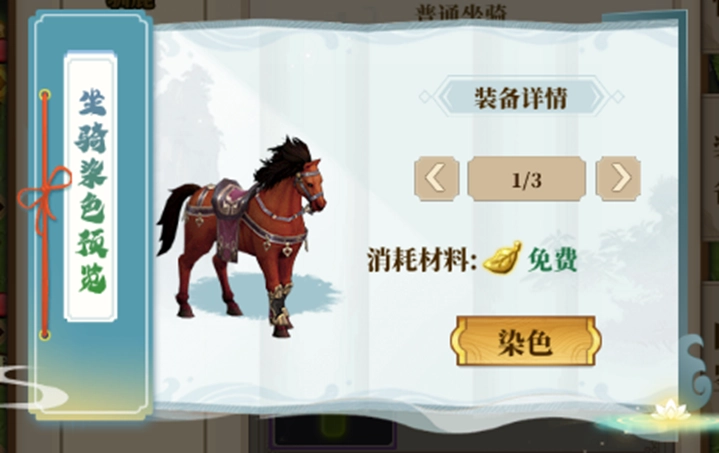 每个坐骑都具备3套染色方案,分别是初始染色、普通染色和进阶染色。